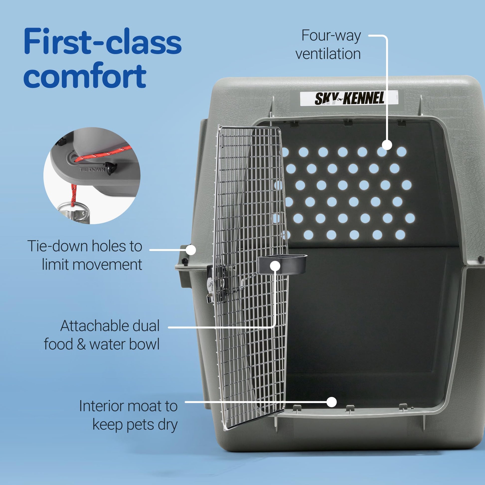 - FIRST-CLASS COMFORT FOR PETS: The Petmate Sky Kennel meets IATA requirements for live animal transport and meets most airline cargo specifications, providing secure air travel for pets; it includes 360-degree ventilation and tie-down strap holes